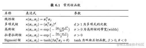 当线性不可分时,将样本从原始空间映射到一个更高维的特征空间,使得样本在这个特征空间内线性可分。常见核函数有: