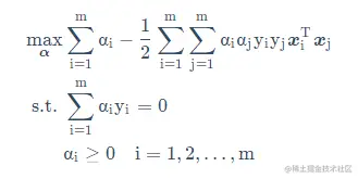 由于函数间隔变化并不影响最优问题求解,因此,将函数变为,并将目标问题转成对偶问题,(将问题简单化,从求解w权重值,到求解a值)。