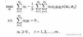 所求解的对偶问题中,无需求解真正的映射函数,而需知道其核函数。目标函数化简为: