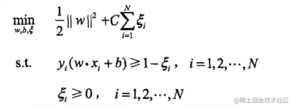 线性不可分意味着某些样本点不能满足函数间隔大于等于1的约束条件,可以为每个样本点引入一个松弛变量(大于0),使得函数间隔加上松弛变量大于等于1,则目标函数变为: