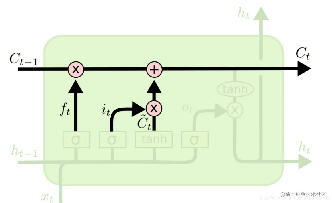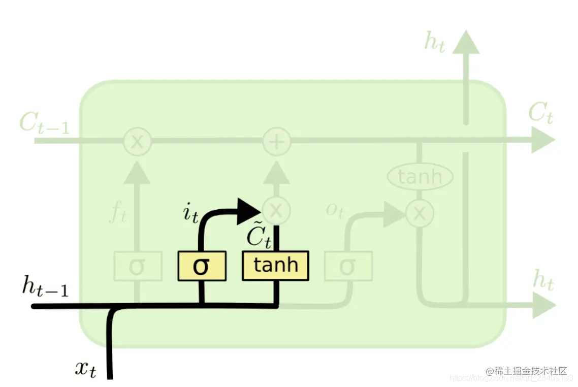 下一步是确定什么样的新信息被保存在细胞状态C中,包含两个部分:sigmoid决定什么值我们将要更新,一个tanh层创建一个新的候选值向量,并加入到状态中。