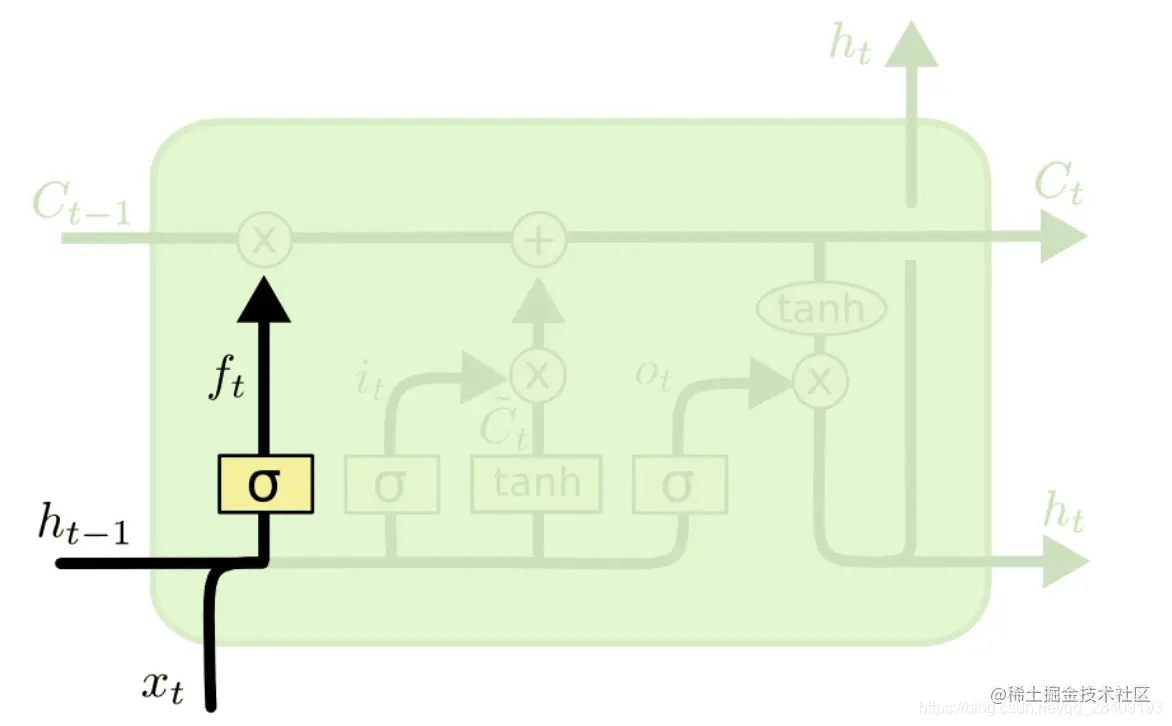 LSTM的第一步是决定我们会从细胞状态中丢弃什么信息。这个通过遗忘门进行判断,具体结构如图: