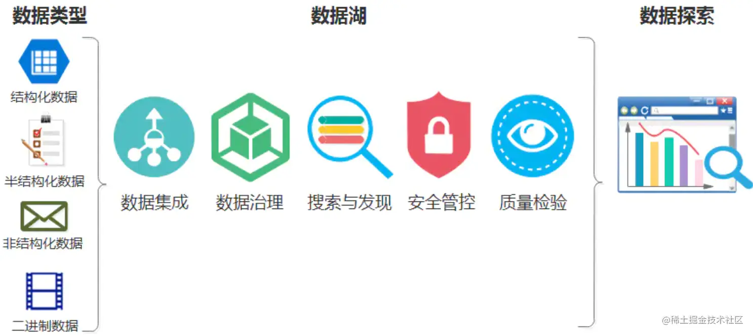 - 其二是管理性,数据湖需要保存原始信息和处理后的信息,在数据源、数据格式、数据周期等维度上,能够追溯数据的接入、存储、分析和使用等流动过程;