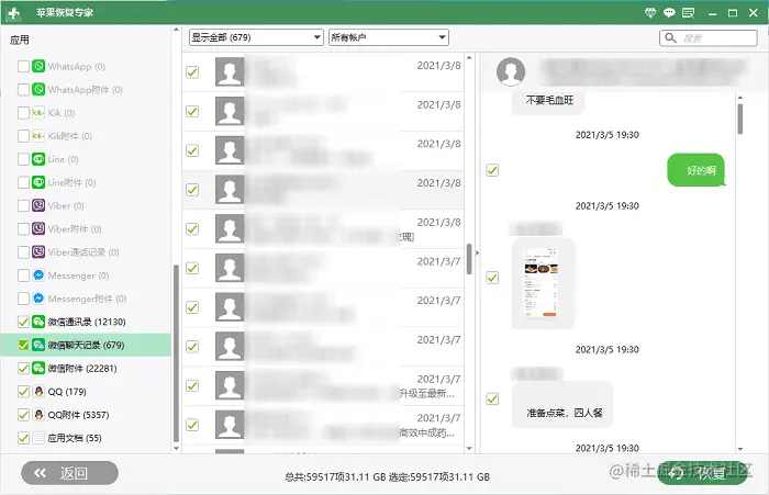 步骤二: 在左侧的应用栏点击“微信聊天记录”,里面就会显示扫描出来的全部正常数据,从中进行选择并恢复即可。