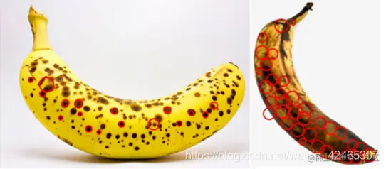 在参数调节结束后,便可以在原图上根据霍夫圆变换获得的圆的三个参数进行标注。我们灰度增强的效果是要将香蕉体表上的斑点视为前景,背景以及蕉身视为背景。效果如图所示: