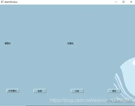 界面设计好后通过指令将界面转化成Python文件,该Python文件是一个类,该类包含了所有的组件信息,比如其名字,位置,以及调用函数。我们再建立一个新的Python文件,并把表示界面的类导入,就可以进行对四个按钮函数内容的编写了。由于我们前面已经把检测和分类的代码实现,故只需稍加改动,便可迁移到我们界面中实现功能和界面的互动。