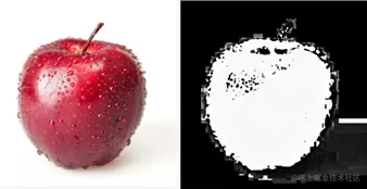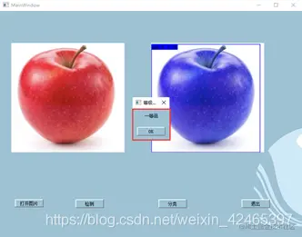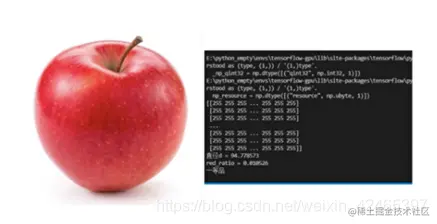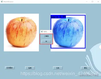 前面提到,我们的分类过程是在检测过程之后,检测后不仅返回图片中目标的类别,同时返回出检测框的左上角和右下角坐标,就可以根据这两个坐标进行截取图片。我们将苹果分为三等,颜色亮丽且形状非常规整视为一等,二等则是那种颜色一般或形状也凑合的,三等则是颜色很差或形状不规整的苹果。并采用最近邻方法进行预测和训练。我们仍采用Python语言进行编写程序,苹果分类软件开发平台与上面的检测平台一致,这里就不赘述。使用Python集成的OpenCv和PIL进行图像的读取与处理,结合数字图像处理中的理论并选取OpenCv中API的合适参数。在求取图像色泽度时,原图和RGB转HSV后H分量后的图片如图所示: