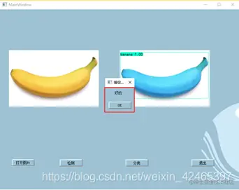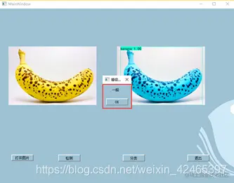 在设计结束界面后,编辑按钮的事件函数。将前面所调试成功的实验内容相应的放入事件函数中,并分别在打开和检测按钮的事件处理函数中加入图片显示的操作。由于处理时所用的图片格式和显示时的格式不统一,便导致显示上有些瑕疵,但并不影响其结果的准确性。下图1是三种水果的检测结果,包括边界框以及置信度信息。下图2是五种水果的检测结果,图下图3,4,5分别显示了香蕉三种品级的分类结果,下图6,7,8分别显示了苹果三种品级的分类结果。