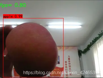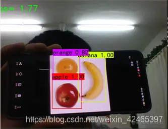 同时,我们可以使用摄像头对包含有水果的图片进行检测。测试步骤为:手机打开一张水果的图片,放到电脑摄像头前,命令行就会打印出检测结果。同样我们包含水果的图片进行测试,图3.8是利用笔记本摄像头检测一张图片,fps指每秒的帧数。图3.9是对应图片的终端输出,输出了检测信息,包含水果的类别和位置坐标。图3.10是对实物的检测结果以及相应的置信度。