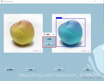如前面所述,界面的设计采用Qt设计师这个软件进行设计,我们使用的控件有按钮,文本框以及对话框。整个GUI界面的背景是选取一个图片,然后设置一个跟其他组件没有继承关系的ListView,然后铺开作为背景,这样不会遮挡其他组件。文本框显示我们打开的图片和处理的图片在整个界面上面的位置。我们使用按钮进行设计所要完成的功能,我们的功能有四个,分别是打开图片,检测目标,水果的分类和退出。打开图片并能够在图片显示控件上显示出来,其中两个图片显示控件的大小都是100*100,因此界面中显示的图片是进行压缩后的。检测后点击检测,便可以得到被检测图片。当点击分类时,首先进行对检测结果的截取,使用分类算法得到其品级。退出按钮即结束所有的工作,退出界面,退出程序的执行。设计的界面如下图所示: