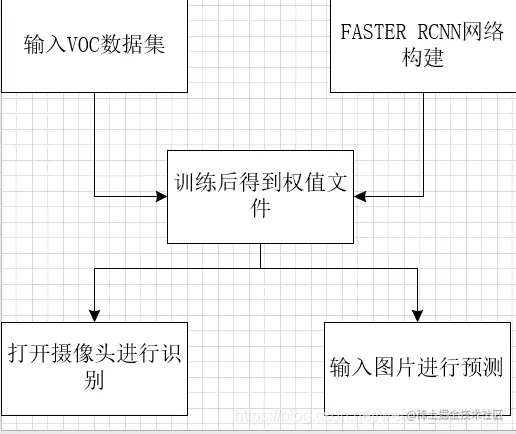 本系统主要包含检测和分类两个部分。其中,检测过程包括水果图片的获取与Pascal VOC格式训练集的制作,FASTER RCNN目标检测网络的搭建,网络的预测过程。其中网络的预测部分可以通过调用摄像头进行验证,或者输入带有目标的图片进行预测。检测系统整体架构如图所示: