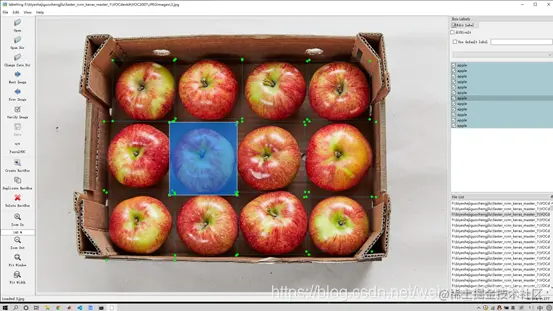 本数据集包含苹果、香蕉、火龙果、草莓和橘子在内的五种不同的水果,数据集采用LabelImg进行制作。LabelImg是一个可视化的图像标定工具,许多目标检测网络(如FASTER RCNN,YOLO,SSD)训练时所需要的数据集,均需要借助这个工具进行图像中目标的标定。生成的XML文件时遵循PASCAL VOC格式。打开LabelImg,进行对训练集中图片的标定。所谓标定,就是选取大小合适的框,将图片中需要检测的物体进行框起来,并标注上框内目标的类别名称。标定过程如图所示: