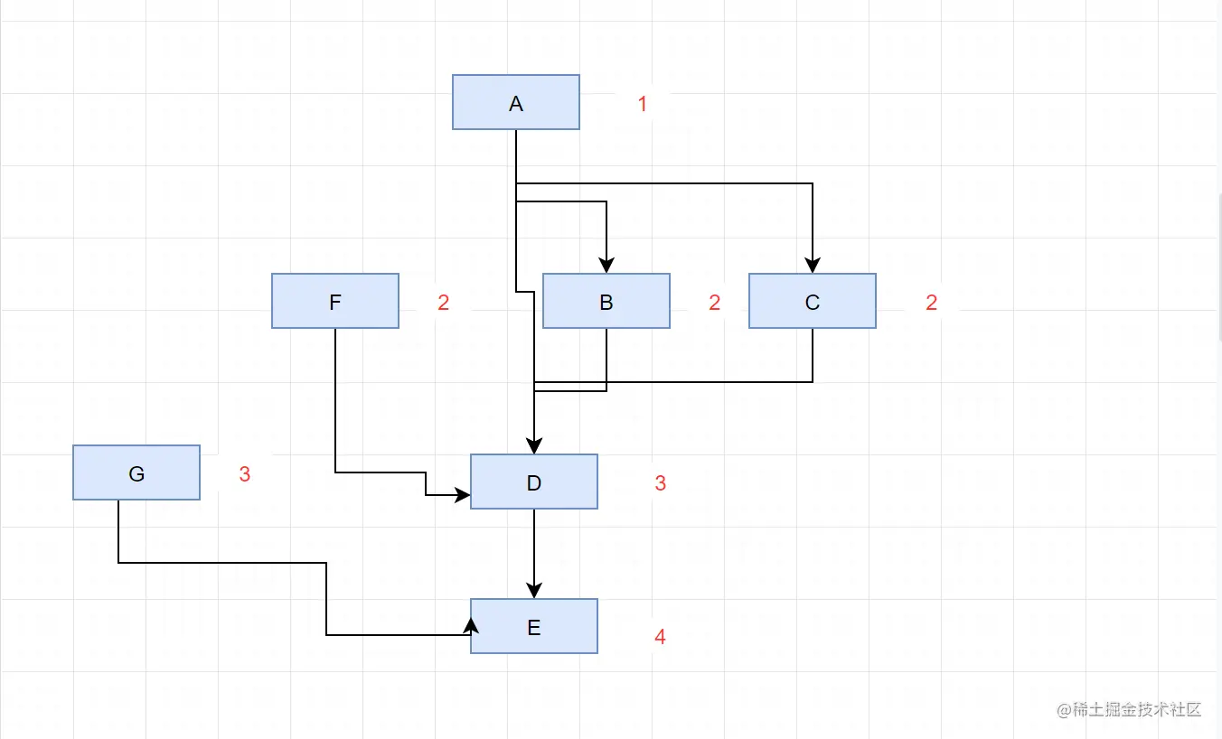 当前我们默认图是从上到下布局方式,节点分层,最容易想到的就是拓扑排序,通过BFS 宽度优先遍历,计算每个节点的步长。