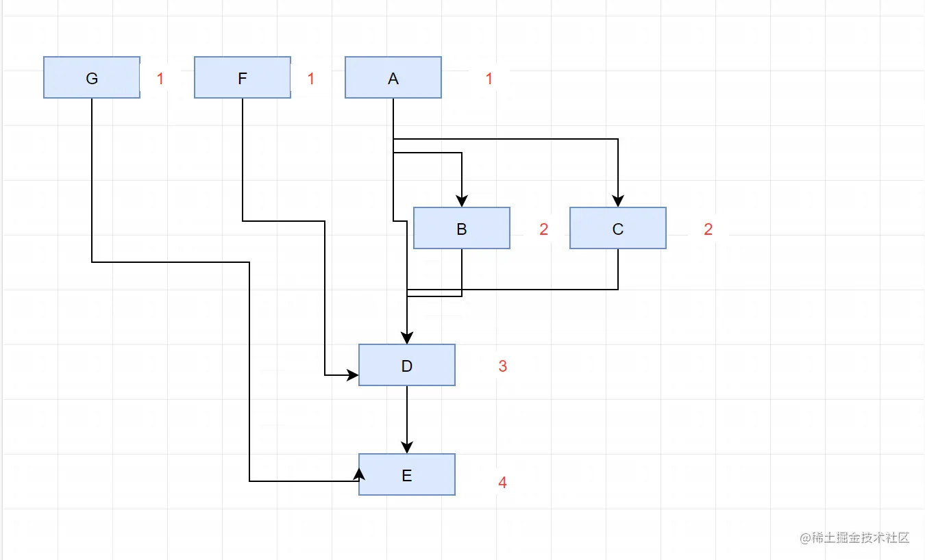 如果是按照刚才那种分发,入度为0 的节点必然在第一层,其实这种,我们可能更希望 G在第三层,F 在第二层,例如下图展示的