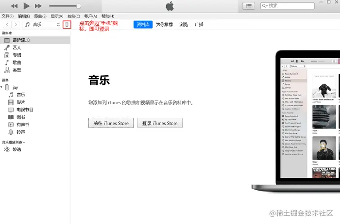 第1步:插入USB数据线使用电脑版iTunes后点击“音乐”旁边的“小手机”可快速的登录;