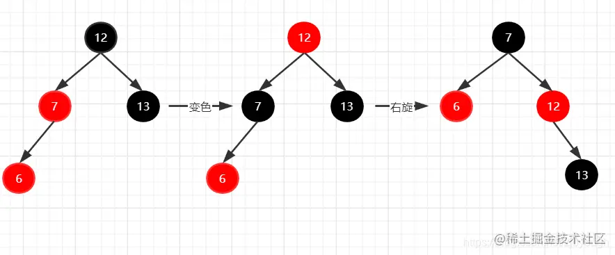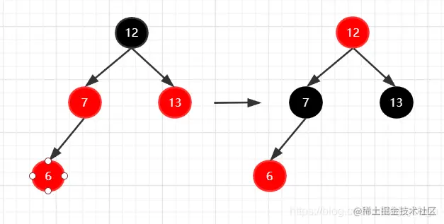 如果新插入节点的父节点和叔叔节点都是红色,只需要将父节点和叔叔节点变为黑色,祖父节点变为红色即可。