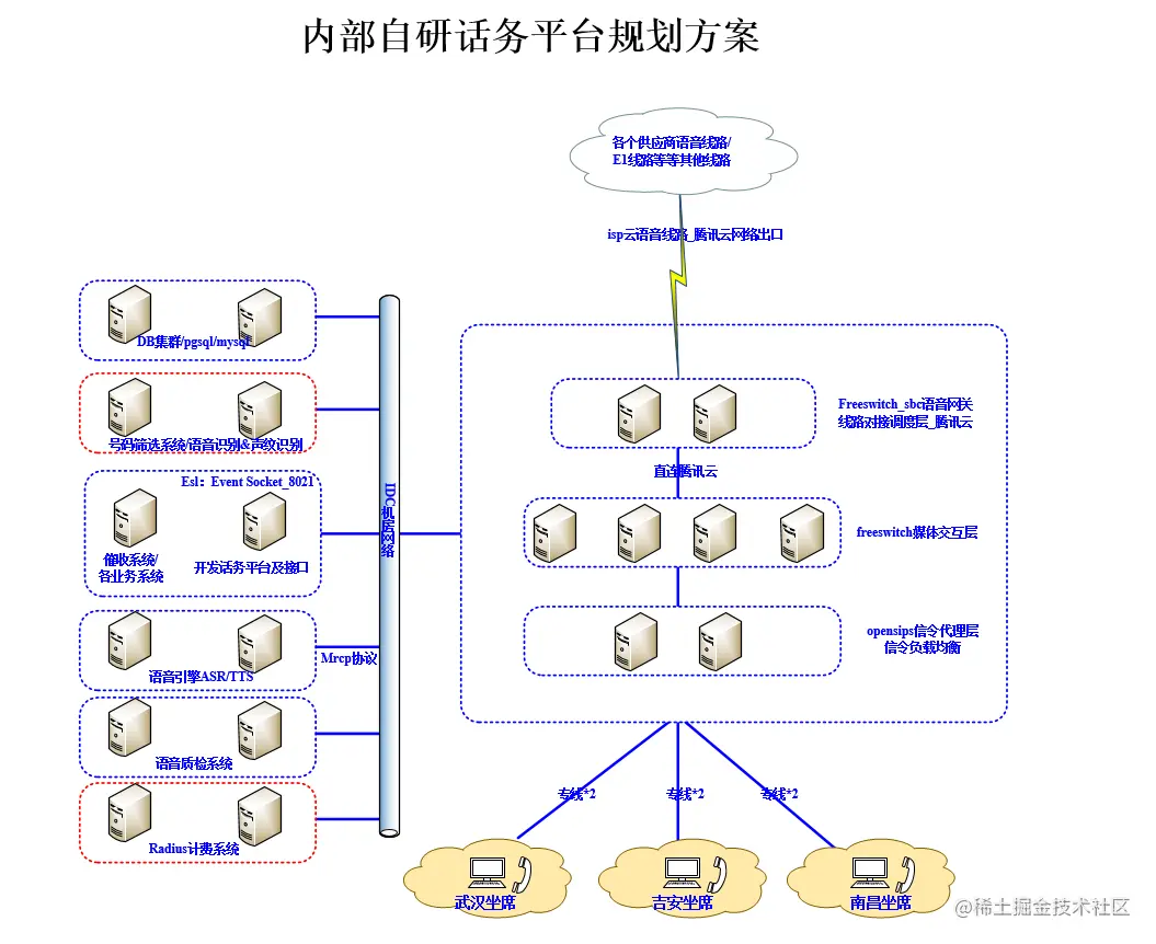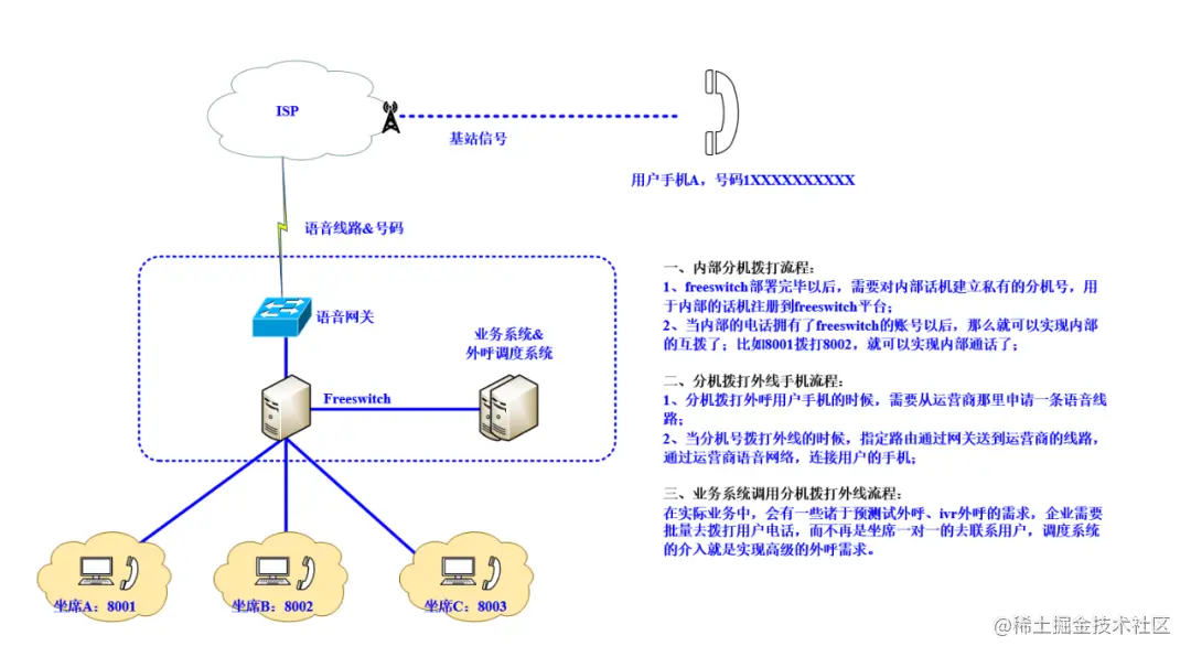 一般来说,一个简单的freeswitch架构,必须需要以下几点,freeswitch平台、语音网关、外呼线路、开发调度平台;