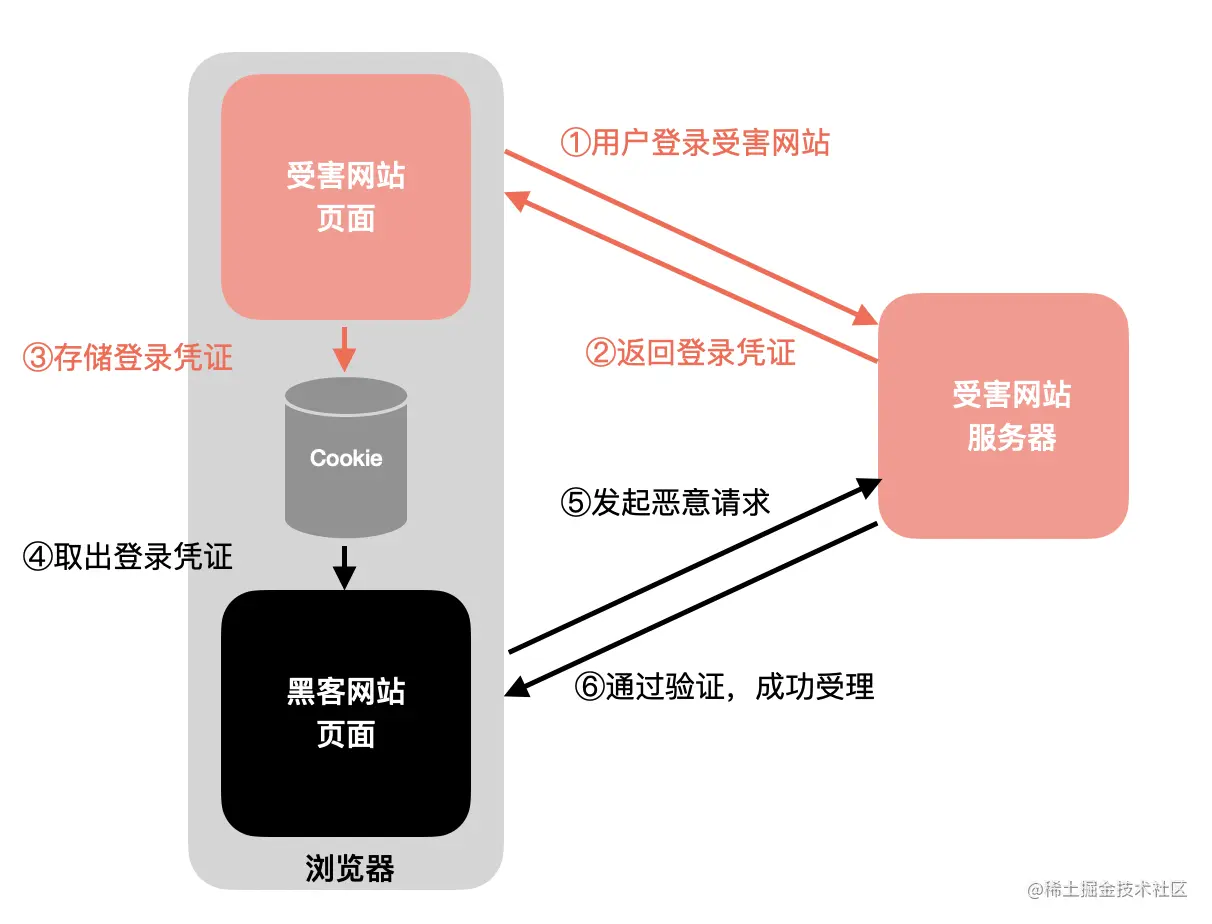 - 用户登录受害网站,把获取的身份凭证保存在浏览器的cookie中。也就是上图流程的①②③;