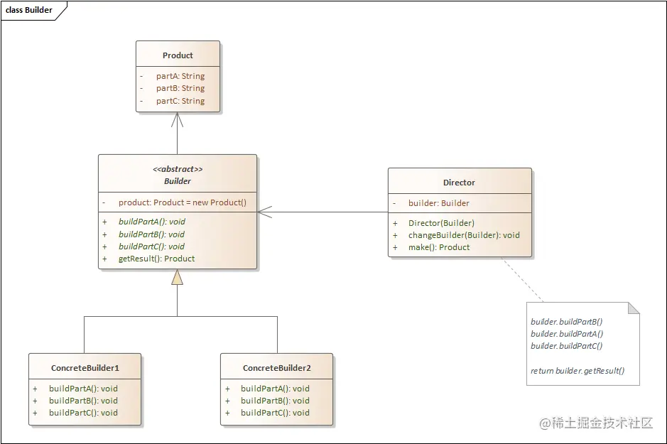 Builder:生成器接口声明在所有子类生成器中通用的产品构造步骤ConcreteBuilder:具体建造者/具体生成器提供构造过程的不同实现,也可以构造不遵循通用接口的产品Product:最终生成的产品对象Director:指挥者定义调用构造步骤的顺序,这样就可以创建和复用特定的产品配置