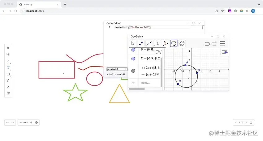 同时在工具栏最下方有一个插件中心,里面我们内置了一些实用的第三方工具,例如代码编辑器、Geogebra 数学教学工具、计时器等。