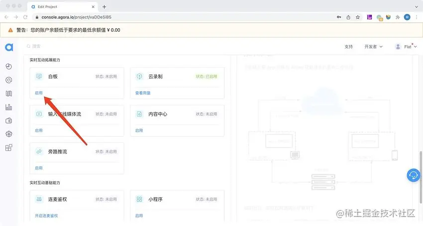 首先我们要有一个声网开发者账号,可以前往 console.agora.io 注册。登录成功后创建一个项目,在项目配置里面开通互动白板服务,如下图。