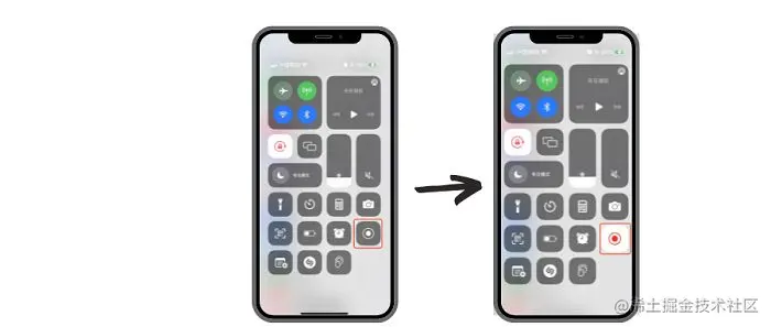 步骤2:我们通过从顶部往下拉把【控制中心】打开后,点击【录制】按钮的图标则可以开始录制手机中的内容。
