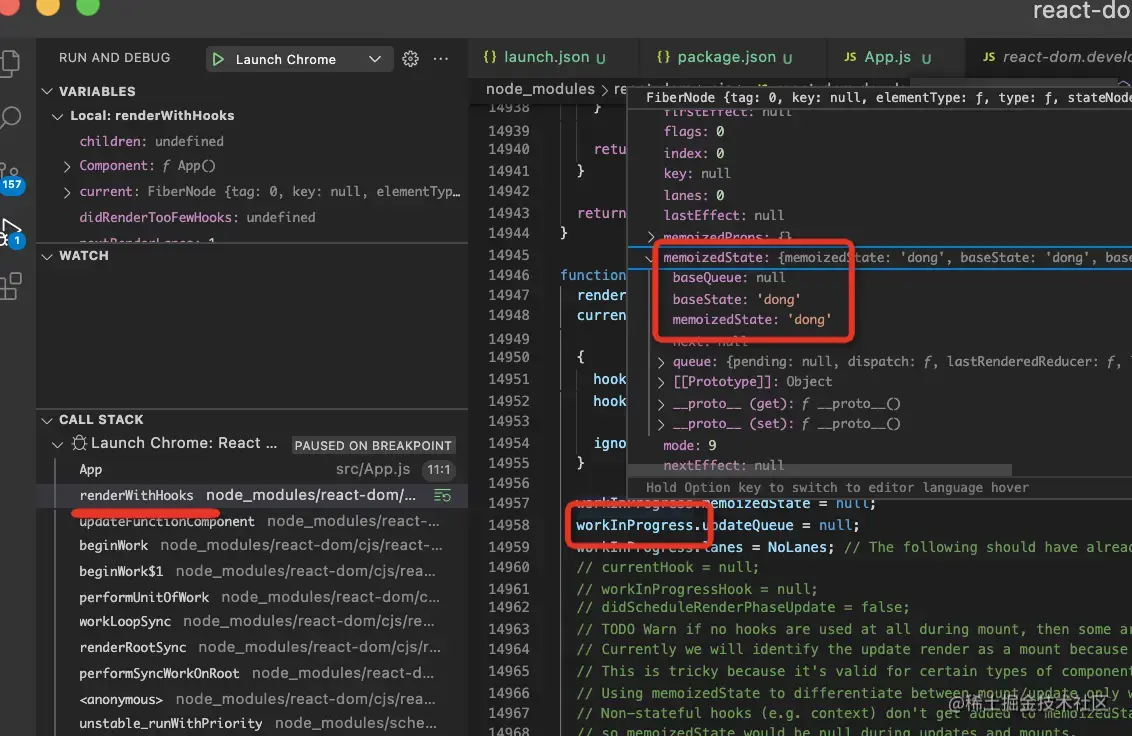 比如渲染的时候会调用 renderWithHooks 方法,里面的 workInProgress 对象就是当前 fiber 节点,它的 memorizedState 属性就是 hooks 存放值的地方: