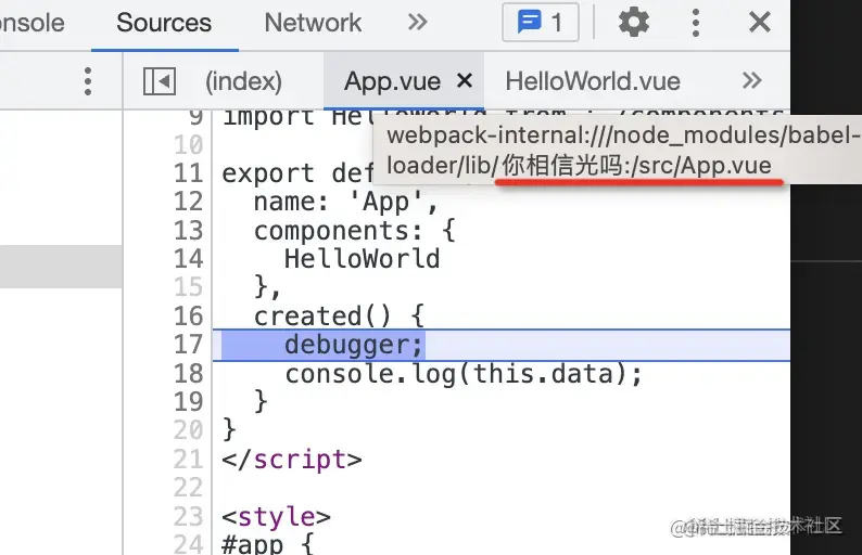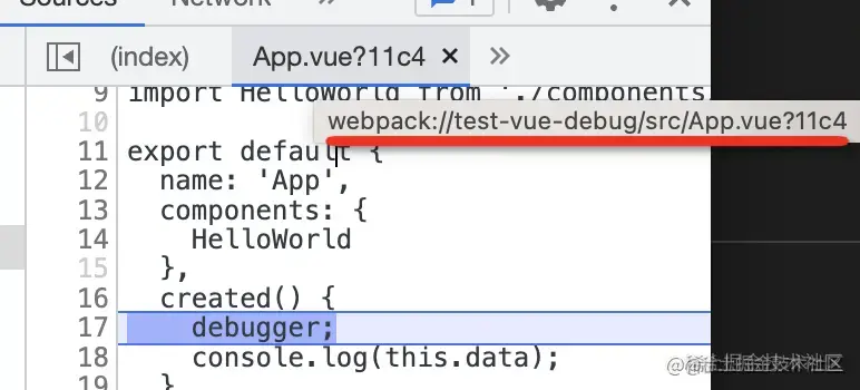 这里的 webpack://test-vue-debug/src/App.vue?11c4 就是要映射的路径,那映射到哪里呢?
