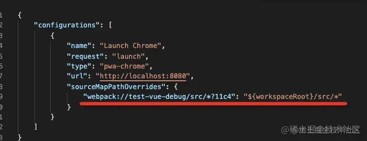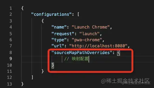 也就是调试配置里多了个 sourceMapPathOverrides:
