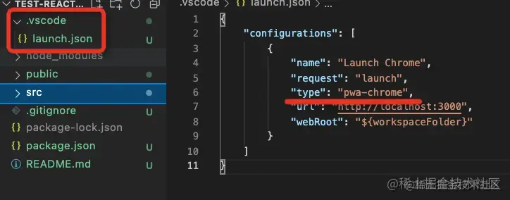 创建了一个调试配置,类型是 chrome,并指定调试的 url 是开发服务器的地址。