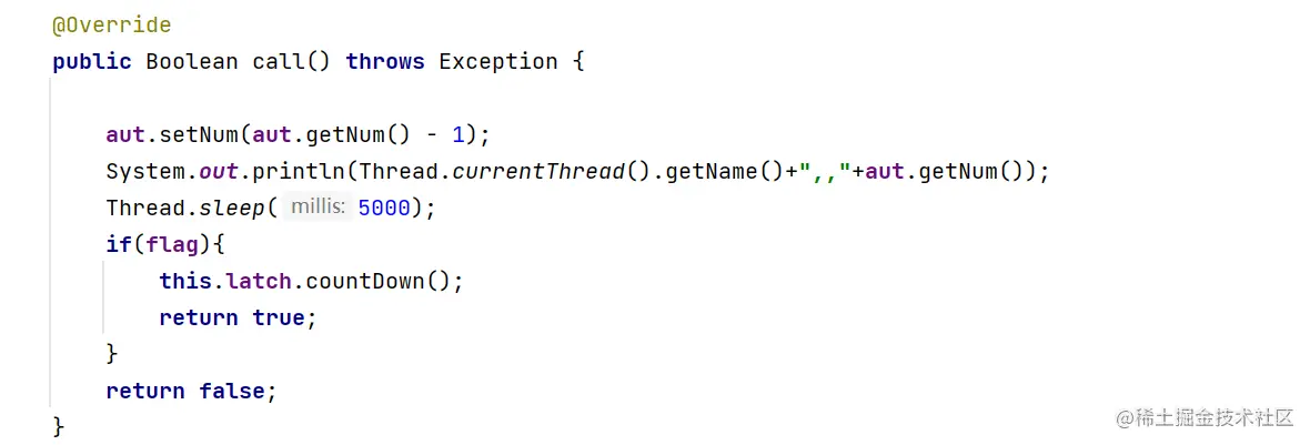 在里面写上我们的逻辑,如果结束标志为FALSE则返回FALSE继续执行,直到结束标志为true,将CountDownLatch计数器减一, 如果不是很好理解,可以看下代码,应该就很清晰了,里面的逻辑具体场景具体分析,比如你有一个变量需要随着分析进行变化,那么你就要考虑锁啊还是啥的,看我们这返回结果