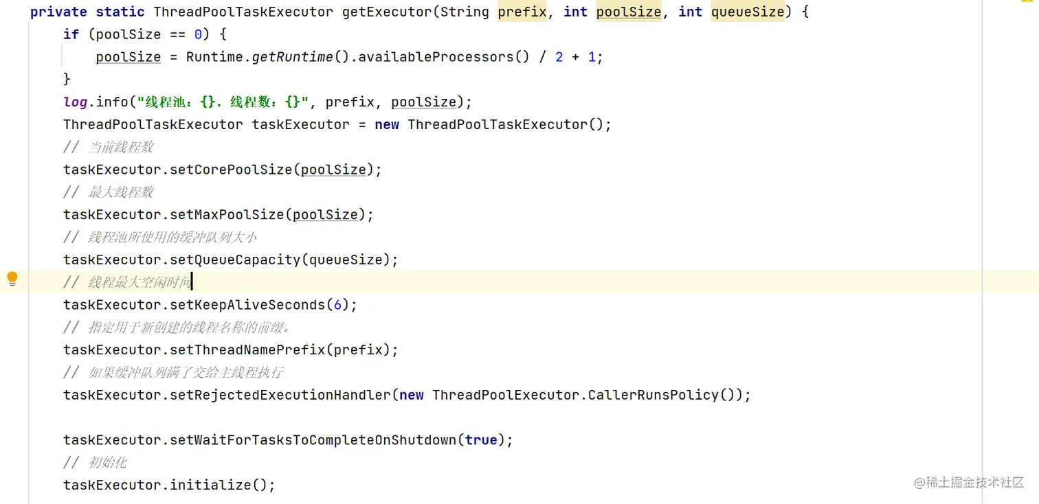首先还是和普通线程池创建的过程一样,指定线程名,核心线程数,最大线程数,队列,拒绝策略,最大空闲时间,下面我用的创建线程池的默认队列方法 是根据我们的队列大小来默认的,