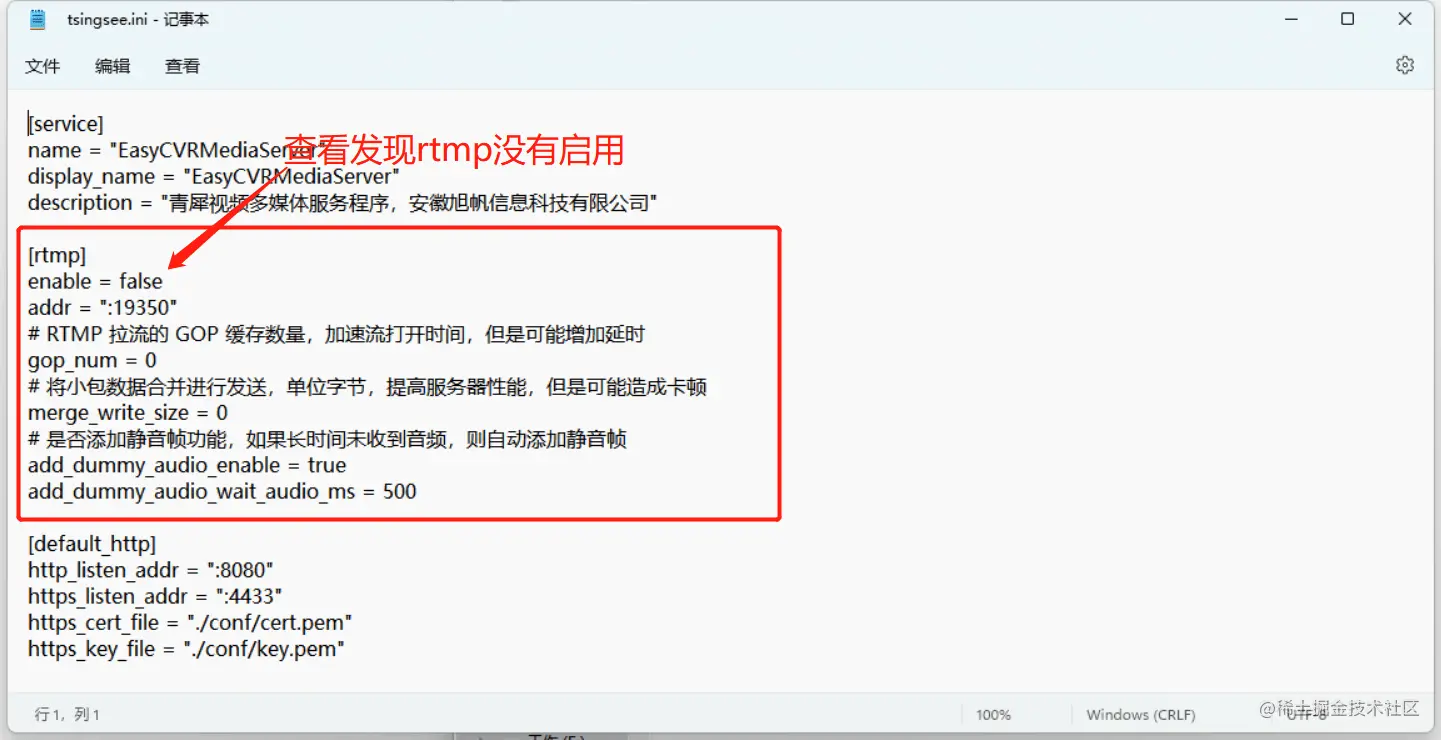 3)服务正常启动,没有显示RTMP推流端口被占用,所以我们查看19350的RTMP推流端口是否开启(/EasyCVR/mediaserver/tsingsee.ini)
