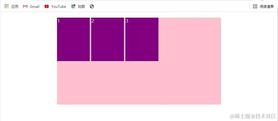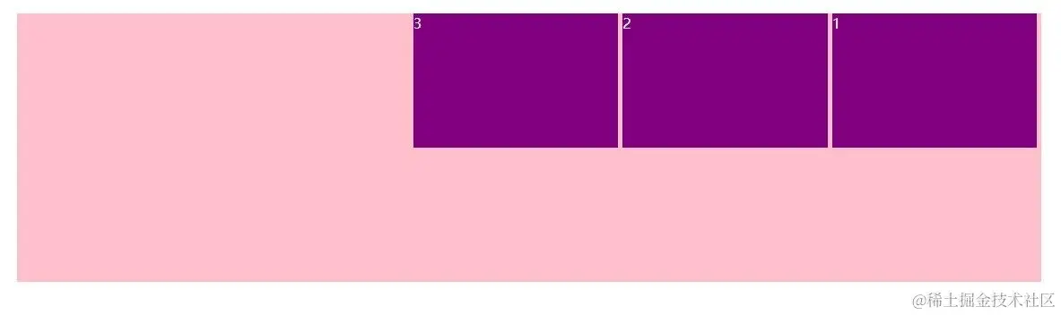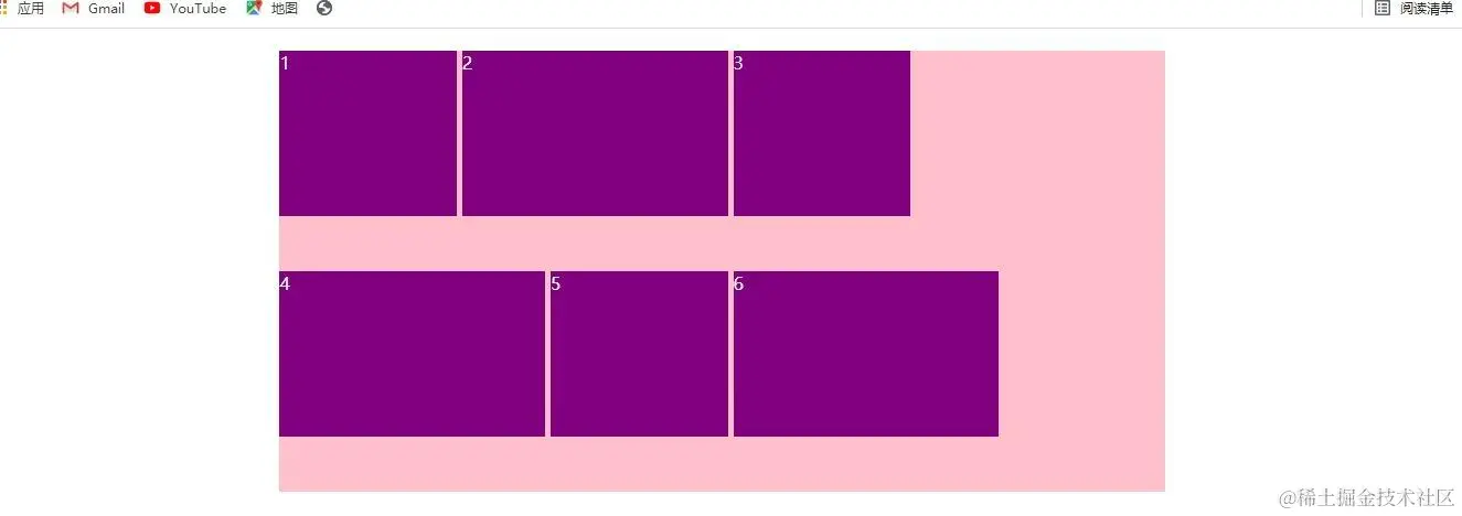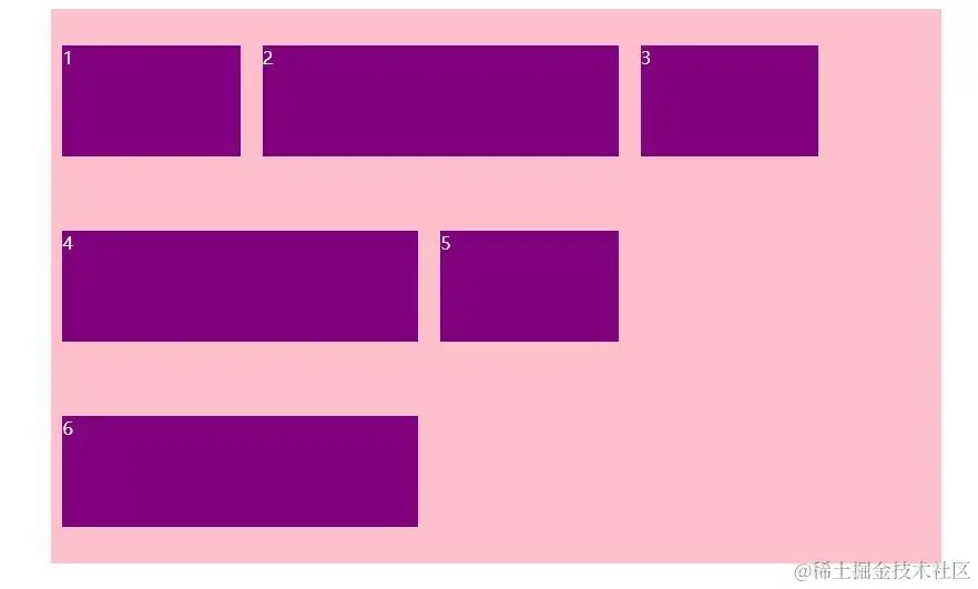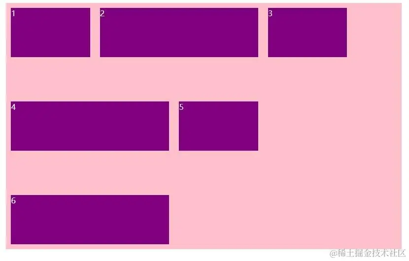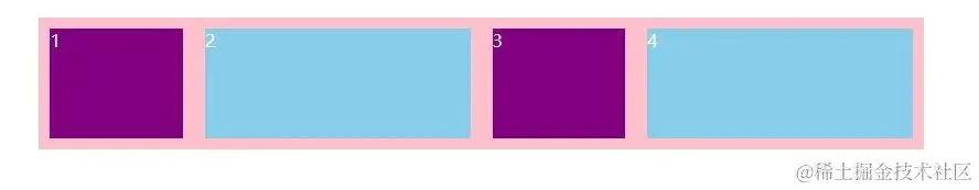 子项目都没有宽度,最后按 flex 的占比分配剩余空间,如第一个紫色项目占剩余空间 1/(1 + 2 + 1 + 2) = 1 /6