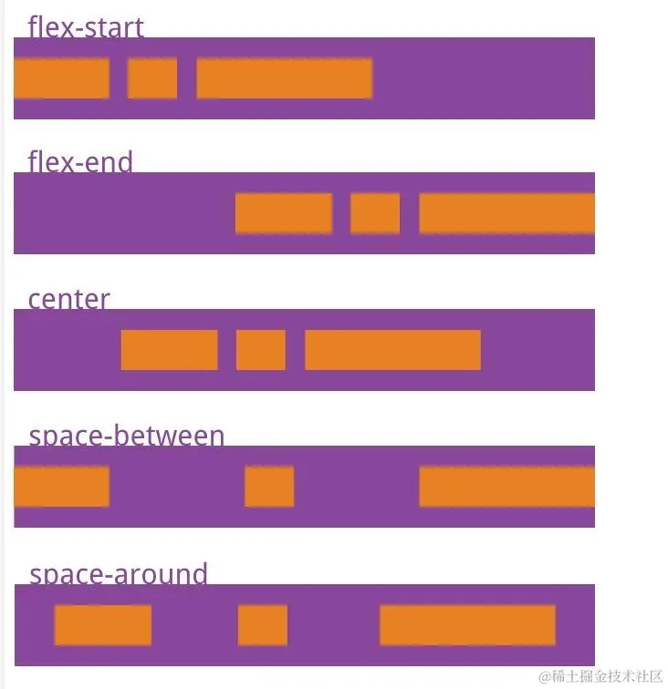 - space-around:所有项目平分剩余空间。每个项目两侧的距离相等。项目之间的距离比项目与边框的间隔大一倍。