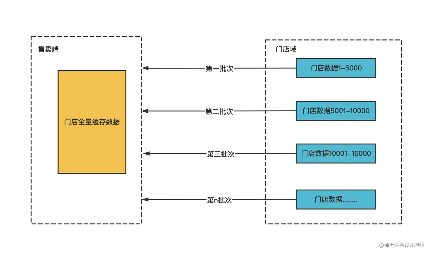 售卖端会定期将全量门店数据同步过去做缓存,数据同步方式是通过门店域提供的分页查询接口,分批次拉取。