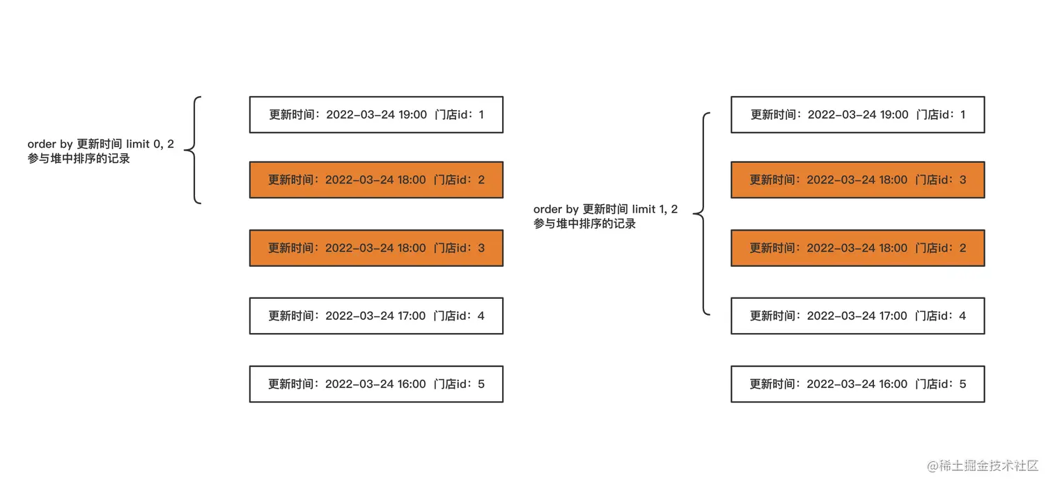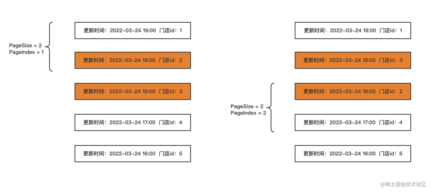 可以看到,前后两次查询一共得到 4 条数据,但去重之后只存在 3 条,原因是前后两次排序结果不一致,排序项值相同的记录(门店id为2,3)顺序被打乱了。