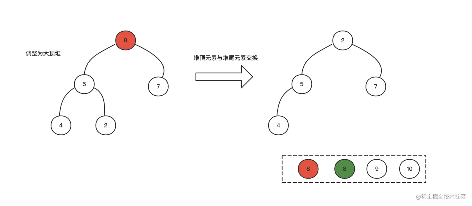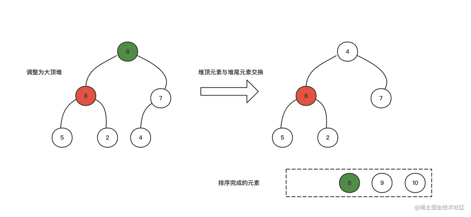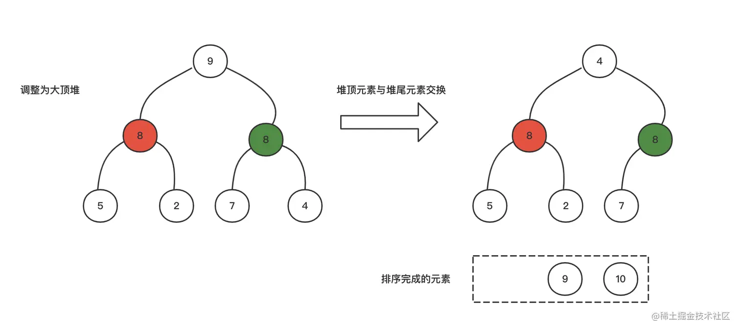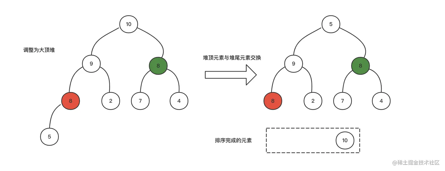 - 排序,堆顶节点与堆尾节点交换,完成堆顶节点的排序