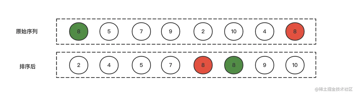 排序算法稳定性的定义:排序项值相同的记录,在排序前后的相对位置不发生变化,即为稳定的算法,反之则为不稳定算法。