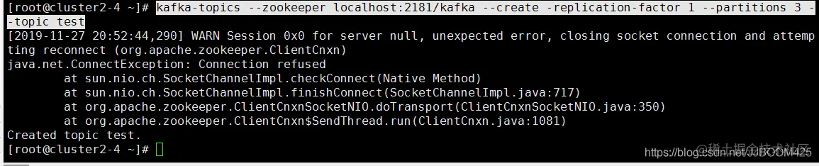 然后再次运行,执行后创建时topic是创建成功了,但是又报了一个异常: