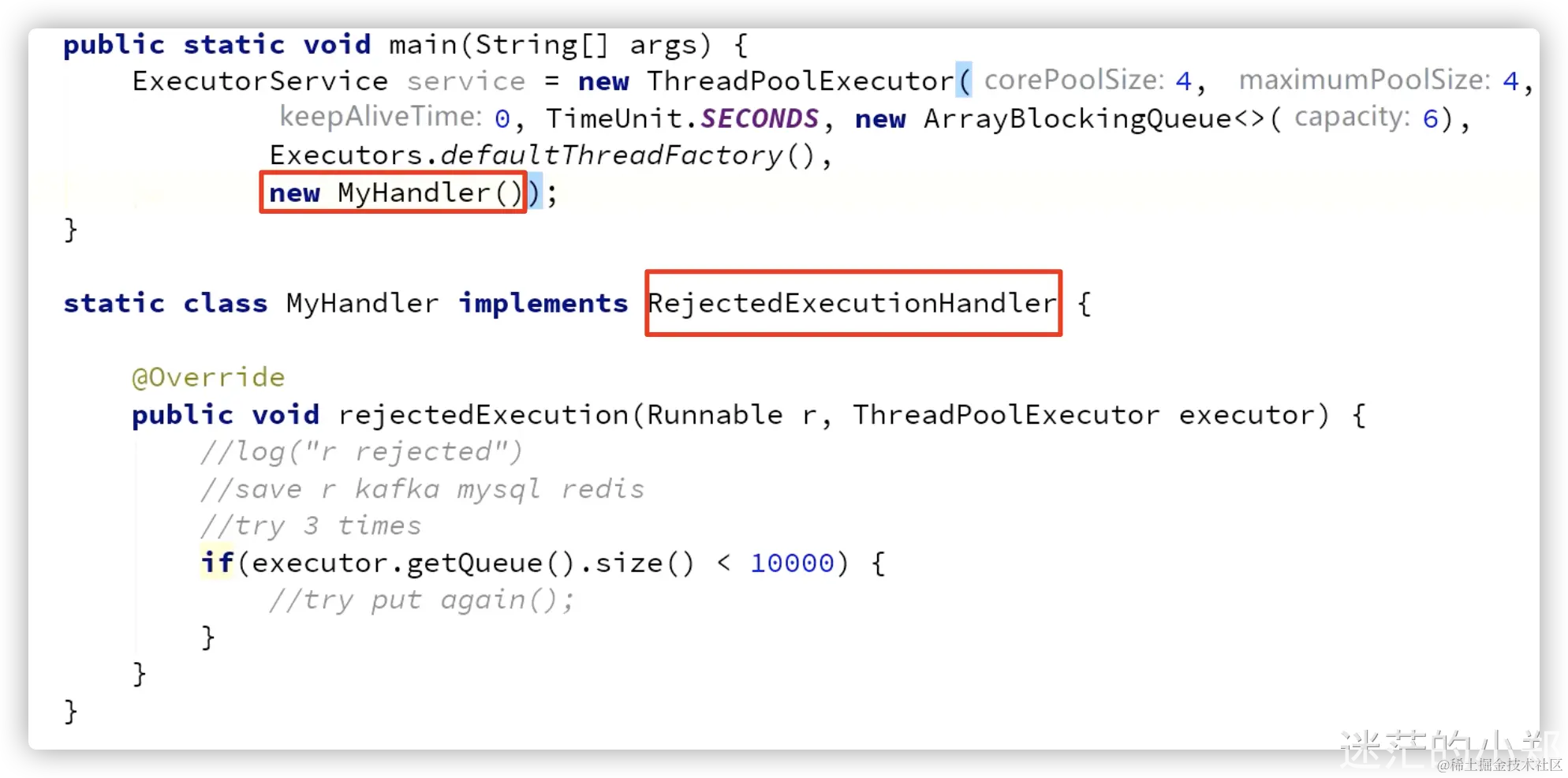 - 线程工厂:通过实现ThreadFactory来自定义线程,可以指定线程的名称,方便出错时回溯,jstack排查时非常有用,提供了默认的工厂