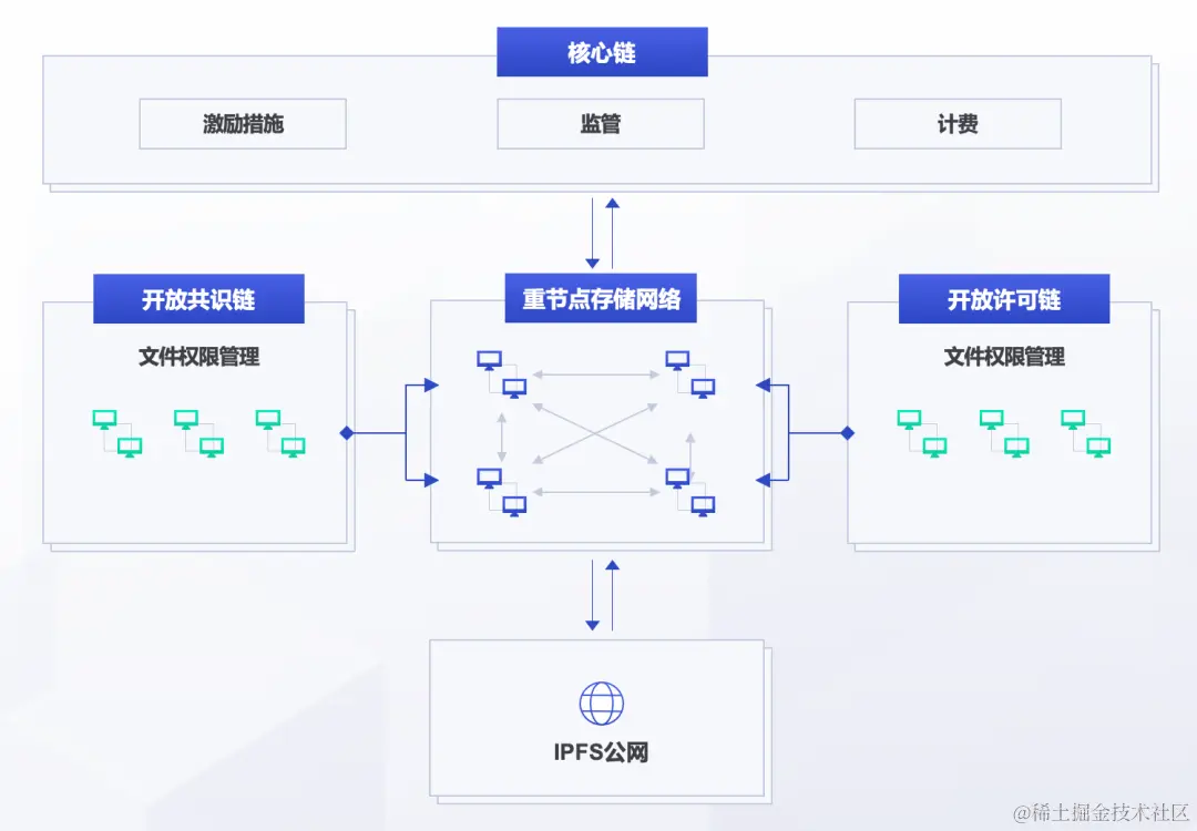 文件服务层: 包含了3大模块(IPFS合约模块、轻节点接入终端和重节点存储网络),并集成了许可IPFS存储网络,为区块链层提供数据支持,可实现文件的去中心化永久存储、权限管理和版本管理。同时,可以保存各类区块链应用数据,例如:将NFT的原数据存储在IPFS网络中,实现数据永久存储,不可更改,公开透明,可查询。