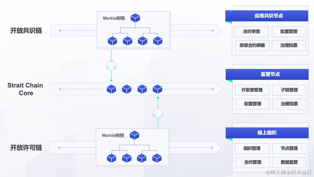 区块链层: 是整个海峡链最核心的部分,负责各项核心工作包括:链上治理、数据监管、合约审核、计费管理等。区块链层由核心链、开放共识链、开放许可链,这3条链以及外部连接桥组成。