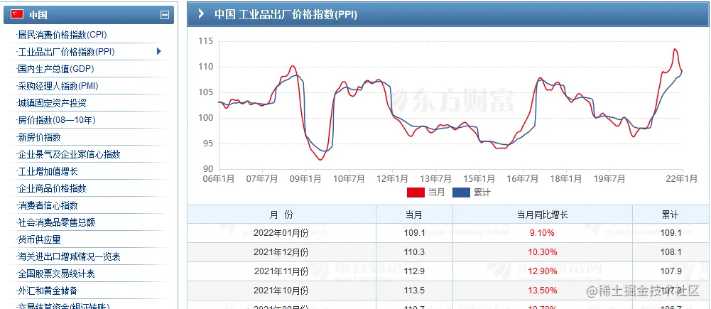 ppi 数据如下所示,这里和 cpi 的数据获取内容类似,只获取月份数据和当月同比增长即可。