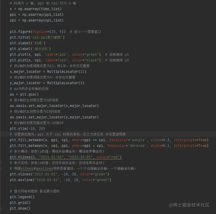 ppi-cpi 剪刀差大家可能都听说过,通过这个指标可以了解当前的经济运行状况,小编为了学习 python 的图形绘制,通过爬虫的方式获取到 ppi 和 cpi 的历史数据,然后通过 matplotlib 绘图工具将 ppi 数据和 cpi 数据同框展示,最后通过颜色填充来表示其中的差额部分。对于新手来讲,会学习到 python 的基础知识、爬虫以及图形绘制的知识。