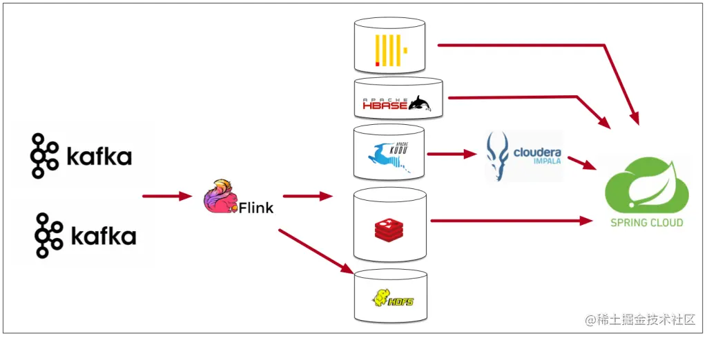 由于 Kudu+Impala 的模式是一个存储和解释引擎分离的架构体系,优雅与否放在一边,更重要的是, Impala 毕竟是运行在 OLAP 平台上的解释引擎,不适合在生产环境里做高并发的查询引擎,这违背 Impala 的设计初衷。随着不断深入的调研,我们尝试使用 Hbase、Clickhouse 替换 Kudu。此时系统架构演变为了计算引擎逐渐固化、存储引擎不断迭代的形态。