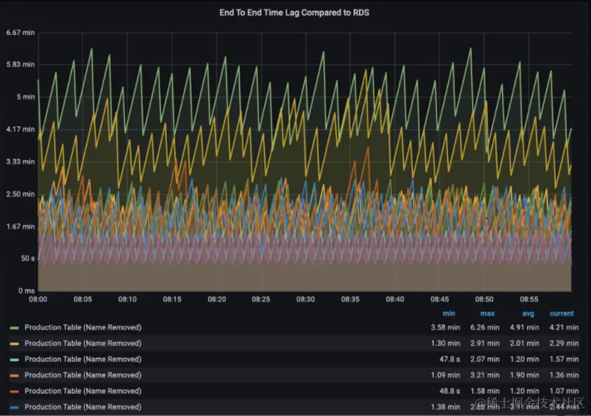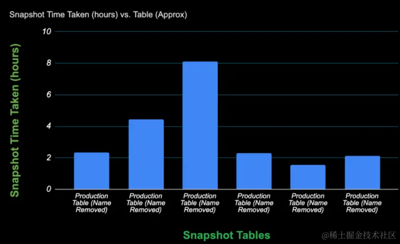 我们已经部署了增量摄取管道,以将 1000 个 Postgres 表摄取到数据湖中。在新架构之前,由于快照的限制和所涉及的成本,这些表只能保证能够以每天的节奏进行快照。 使用这种新架构,Data Lake 用户很高兴看到关键表的数据新鲜度从 24 小时缩短到 15 分钟以下。 大批量快照运行时间显示快照表的运行时间长。请注意由于只读副本 I/O 瓶颈,其中许多表的快照需要按顺序运行。