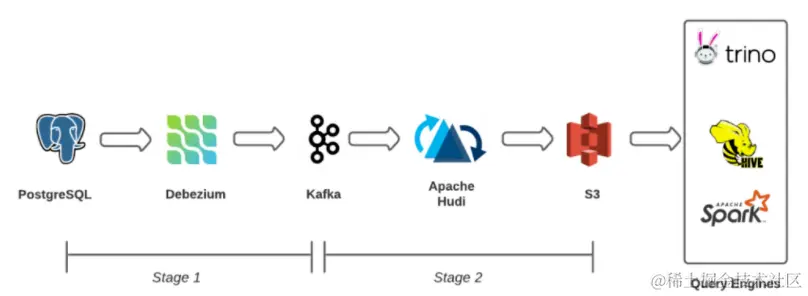 实现 Data Lake 较低数据新鲜度的更好方法是增量摄取。增量摄取是一种众所周知的技术,用于为数据湖构建有效的摄取管道。在这里摄取管道不是拍摄快照并将它们作为一个整体转储到 Data Lake,而是以流方式使用 OLTP 数据库的预写日志并将它们摄取到 Data Lake 表中,就像数据库到数据库复制的方式一样。从概念上讲,我们有一个两阶段管道。
