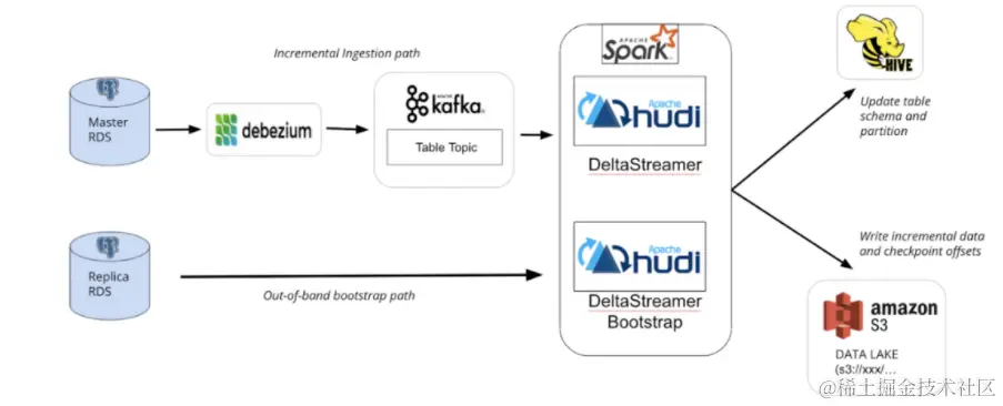 •保存最新的 Kafka 偏移量,以在切换到增量摄取时用于重播变更日志。设“Tₛ”为最新事件的源时间。•确保只读副本在时间“Tₛ + Δ”时是最新的,其中 Δ 表示捕获 kafka 偏移量以及额外缓冲时间时的 Debezium 延迟。否则,整个方程式将无法保证 0% 的数据丢失。从只读副本中获取表的初始快照并创建 Data Lake 表•从之前存储的 kafka 偏移量开始消费并执行表的增量摄取。一旦增量摄取开始发生,将配置单元表定义同步到数据的最新位置,下游消费者现在将能够查询新引导的表。