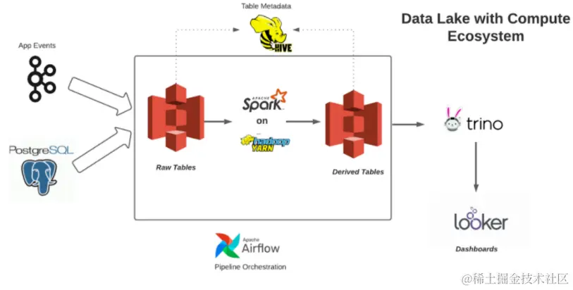 主要的 OLTP(在线事务处理)数据库由 Postgres RDS 管理;Amazon S3 是 Data Lake 存储,它为我们的 Data Lake 提供经济高效且可扩展的存储层;我们主要使用 Apache Spark 运行生产批处理管道;我们的仪表板由 Trino 分布式 SQL 查询引擎提供支持;Apache Hadoop Yarn 管理用于运行 Apache Spark 作业的计算集群;Apache Hive Metastore 为查询引擎管理和提供表模式;Apache Airflow 是工作流编排服务。下图是具有计算生态系统的数据湖